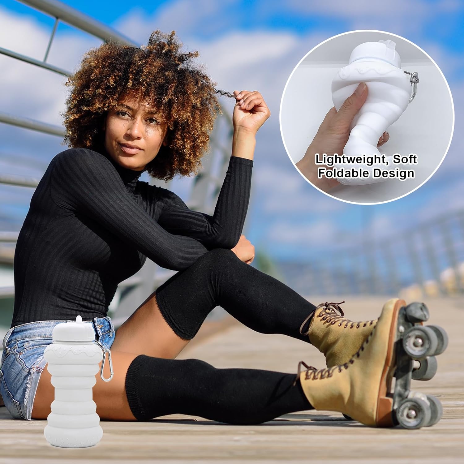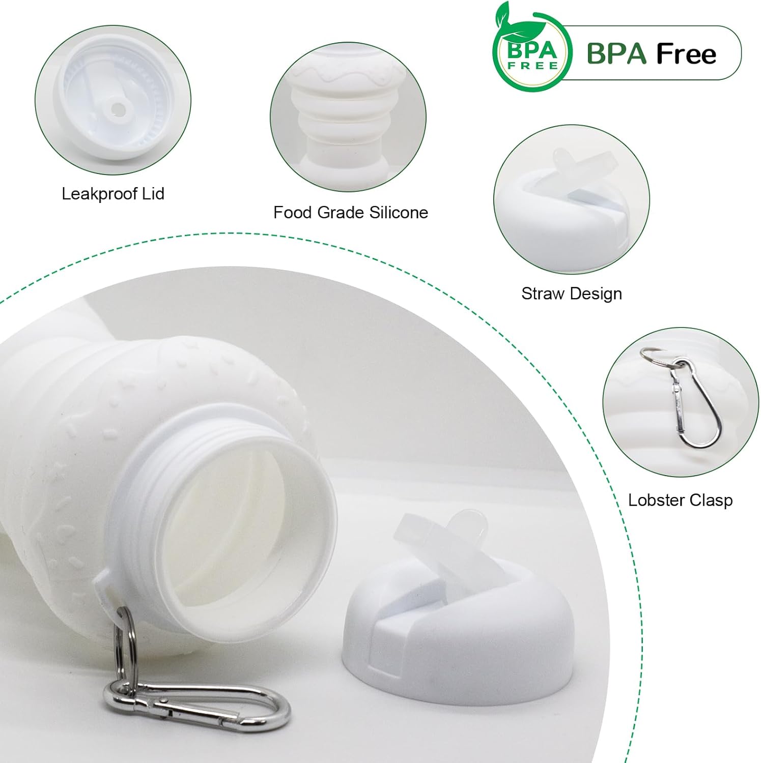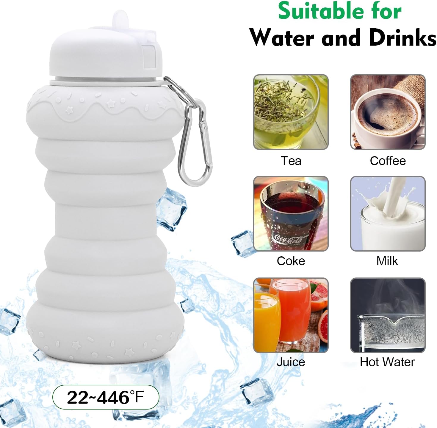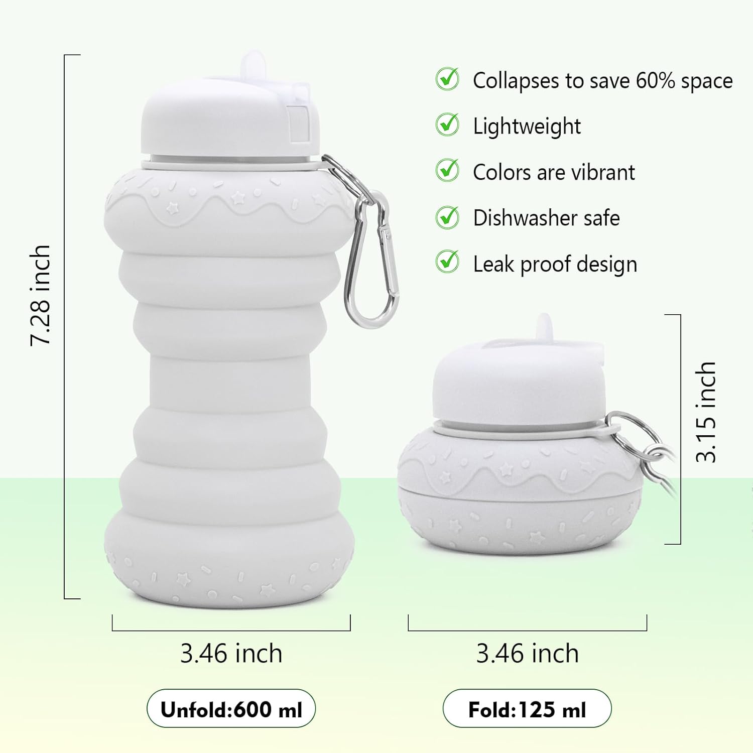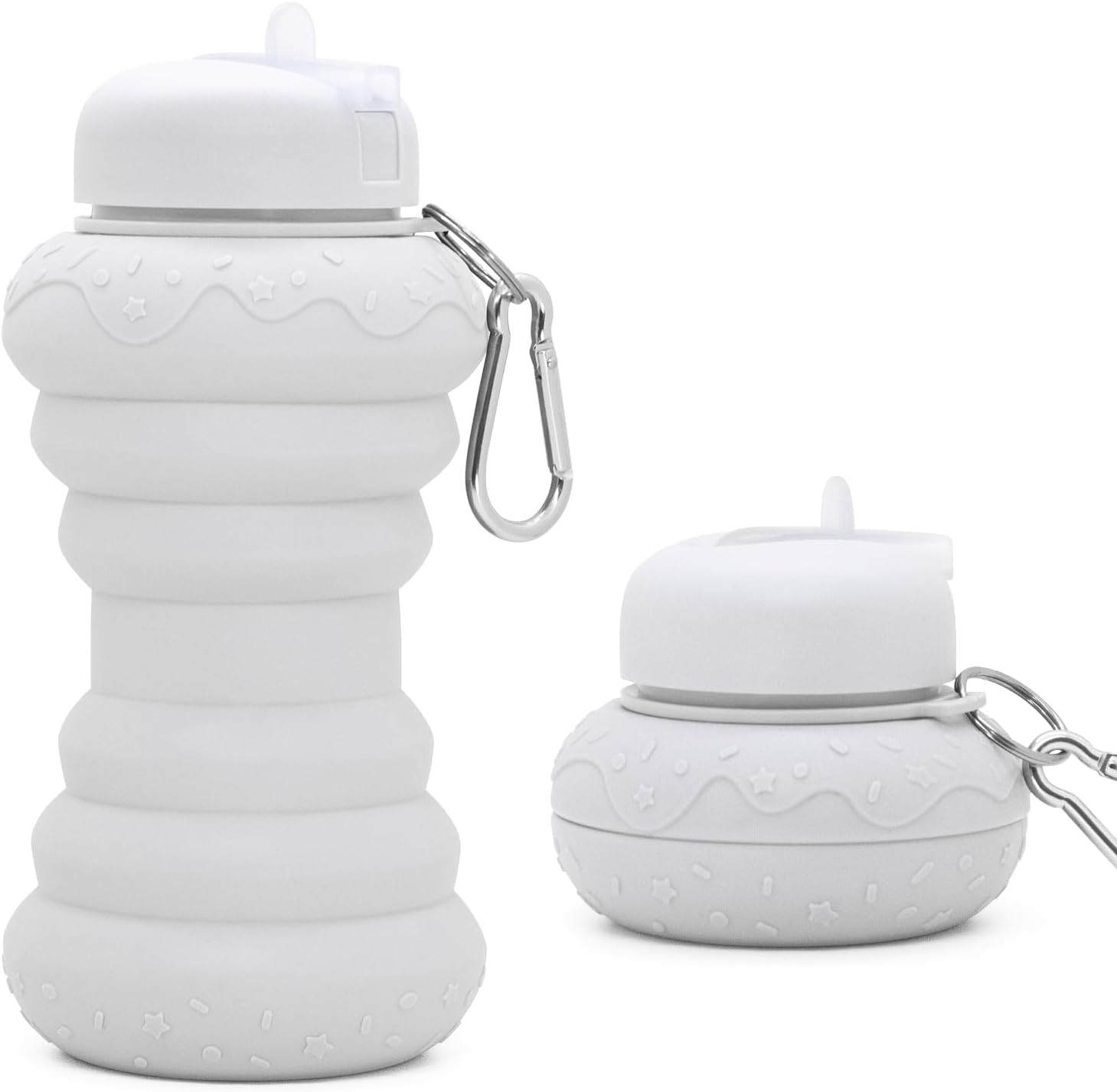Collapsible Water Bottle Reusable Water Bottle For Outdoors & Indoors Leak-Proof and Shatter-Proof, BPA Free, Safe, Non-Toxic, Durable Silicone Doughnut Style 20oz White Sports Water Bottle